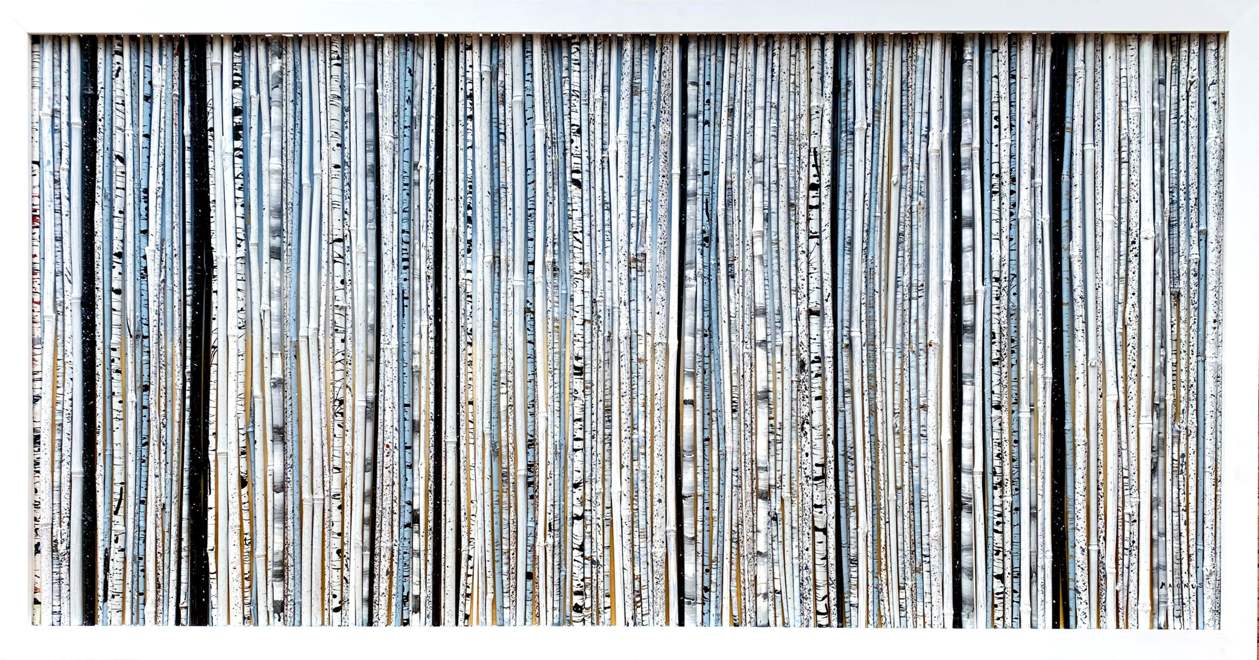 Individually hand-painted pieces of bamboo and elephant grass, selectively arranged and permanently mounted against a gradient painted backboard in a custom frame. Part of the "NatureScapes" series. Professionally framed in contemporary, white satin lacquered, solid wood frame. Shipping will be calculated after purchase and billed separately.