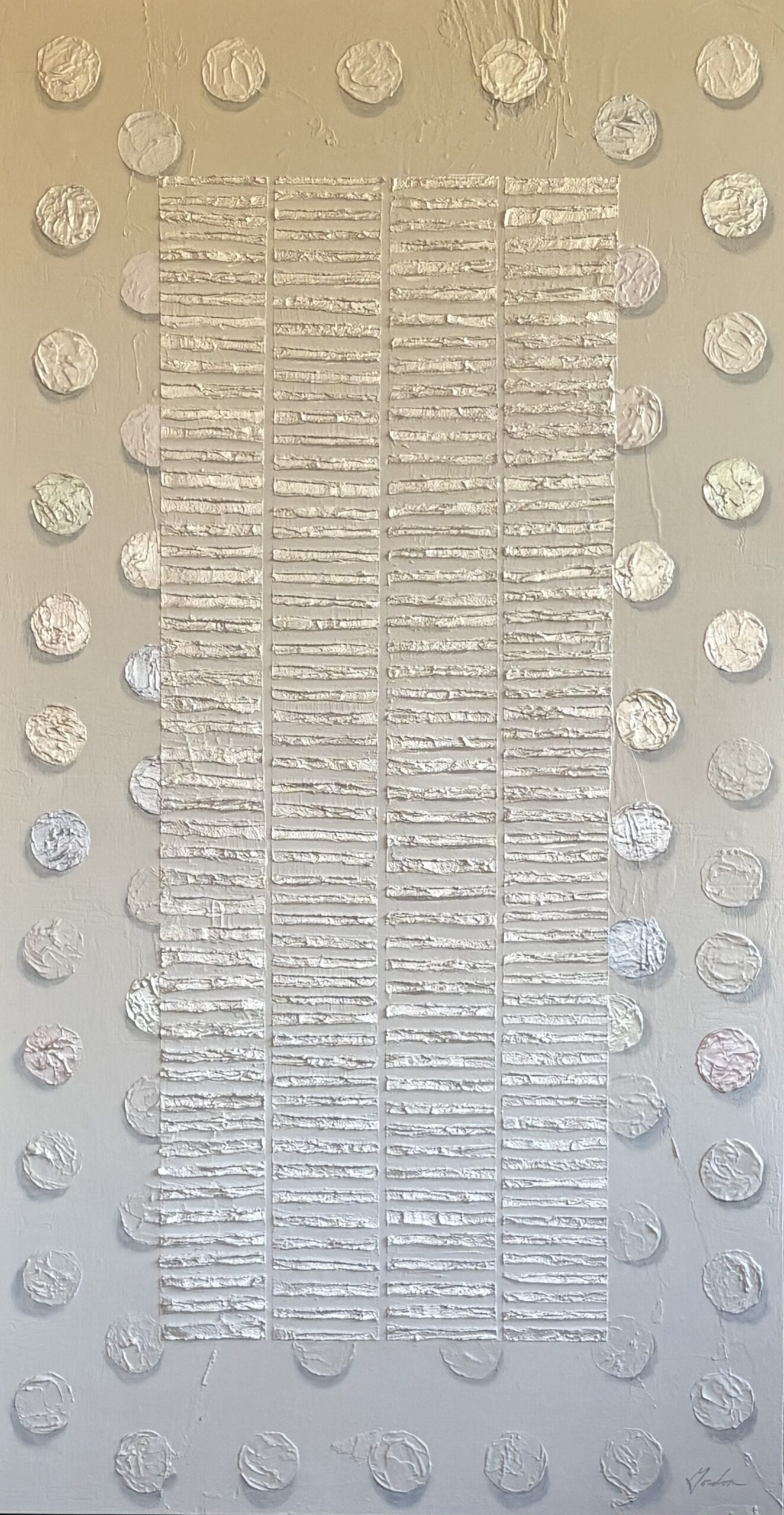 The first of the Dots and Dashes series. Each dot color is mixed by hand, the color before it goes into the next dot and so on and so on. The dots are thick, high gloss acrylic paint on board. They appear to float over a textured background. The transparent shadows add to the dimension and illusion. The center field is a series of heavy faux stone dashes highlighted with pearlescent paint.