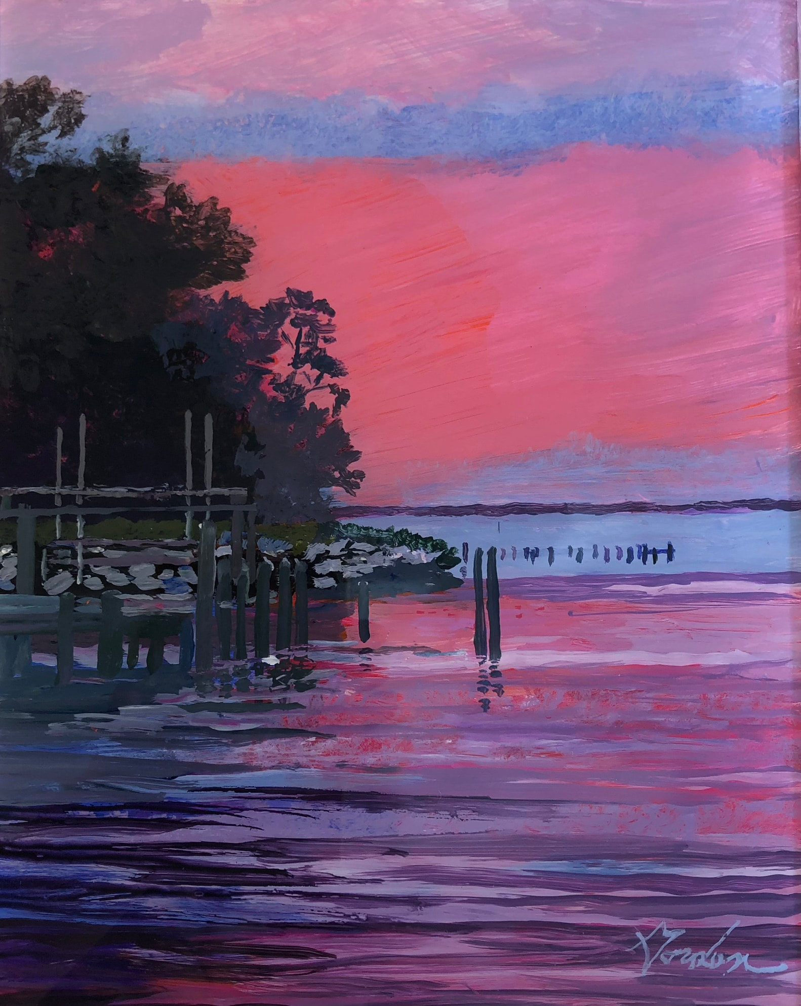 Part of the Reverse Painting series. Reverse painting consists of several layers of paint applied to one side of the plexiglass while the painting is viewed from the other side. In creating such a painting, the sequence of paint application is reversed. The thickness of the plexiglass serves to amplify and saturate the colors.