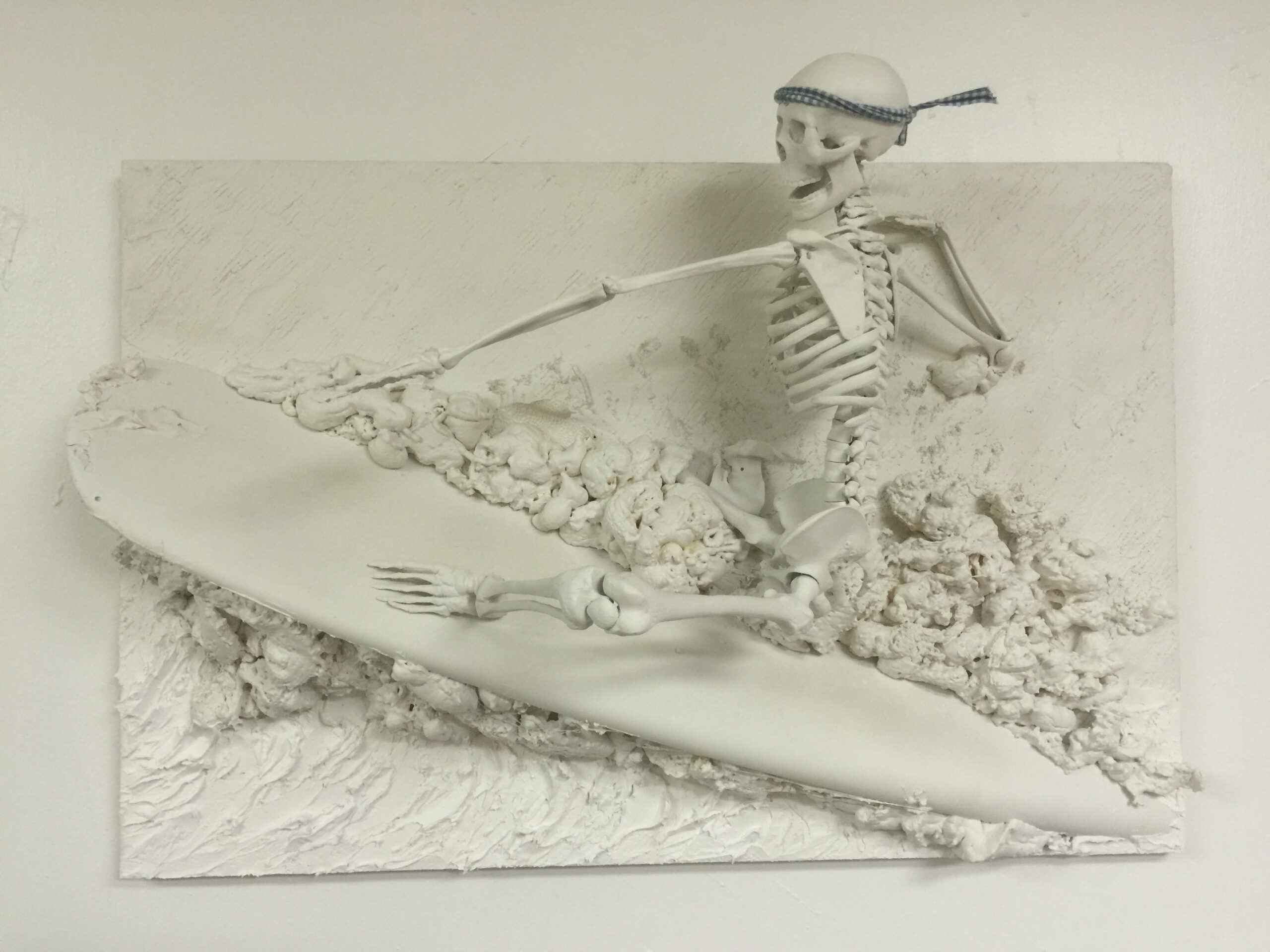 Mixed media sculpture by Magnus Sebastian. This one-of-a-kind sculpture incorporates a life-size resin human skeleton riding a vintage "Impact" surfboard signed by master shaper Charles Williams of Fort Pierce Florida. It's a 1/3 scale version of the full-sized "Cavefish Surfer". Perfectly cantilevered on a cradled wood board and finished with a unique bone white finish this is the ultimate depiction of "old surfers never die"