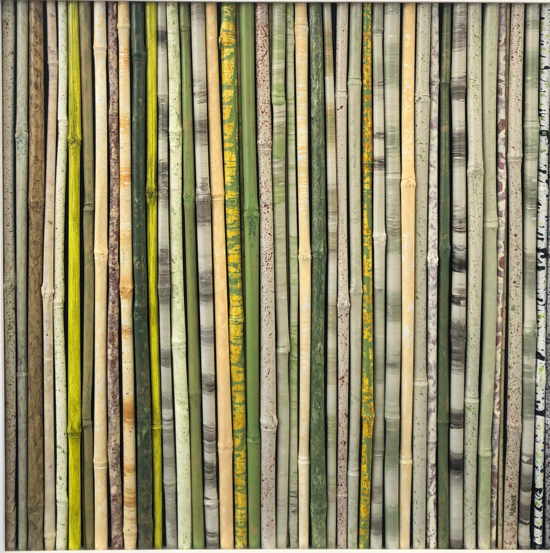 Individually hand-painted pieces of bamboo and elephant grass, selectively arranged and permanently mounted against a gradient painted backboard in a custom frame. Part of the "NatureScapes" series. Professionally framed in contemporary, white satin lacquered, solid wood frame. Shipping will be calculated after purchase and billed separately.