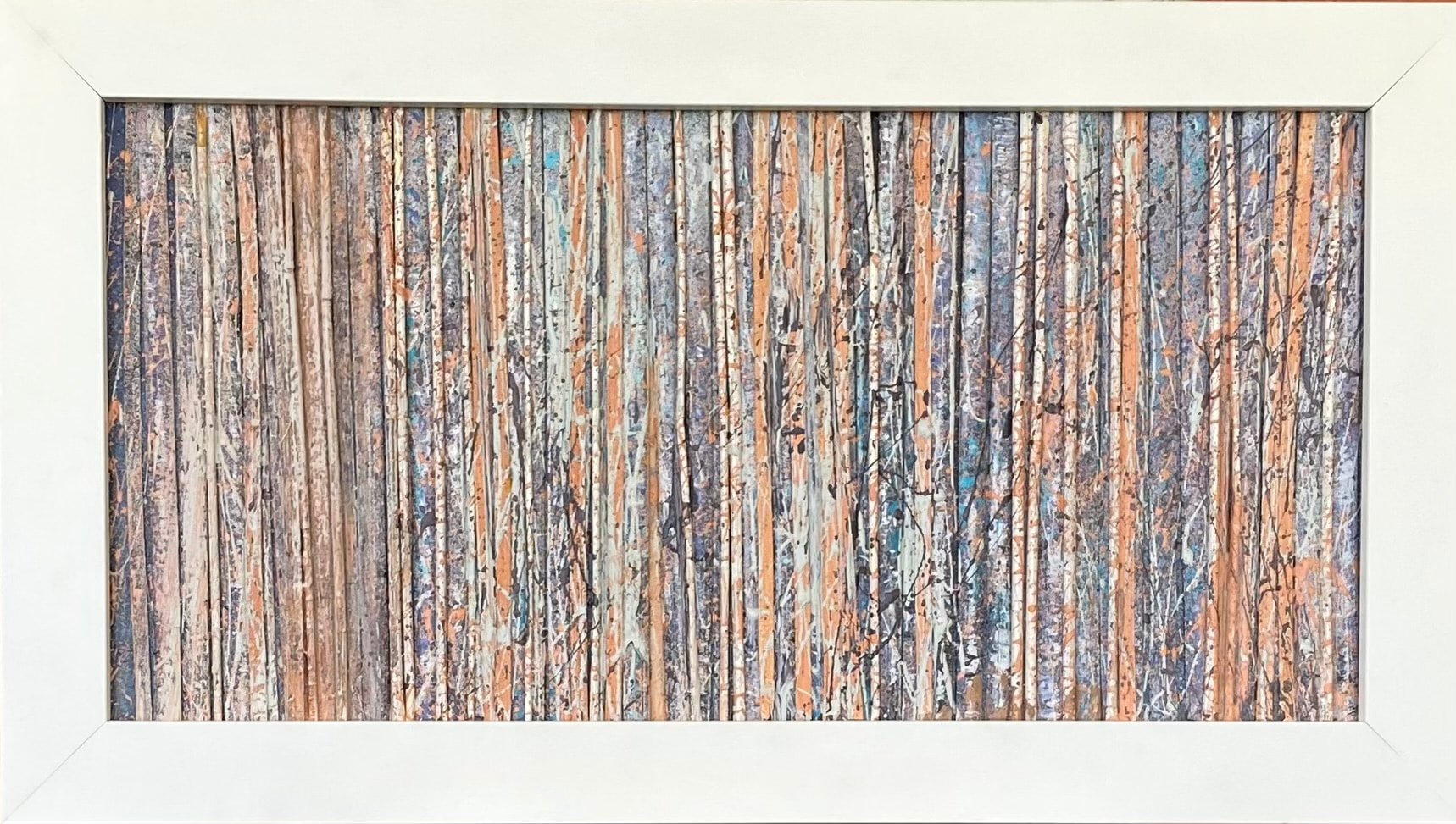 Individually hand-painted pieces of bamboo and elephant grass, selectively arranged and permanently mounted against a gradient painted backboard in a custom frame. Part of the "NatureScapes" series. Professionally framed in contemporary, white satin lacquered, solid wood frame. Shipping will be calculated after purchase and billed separately.