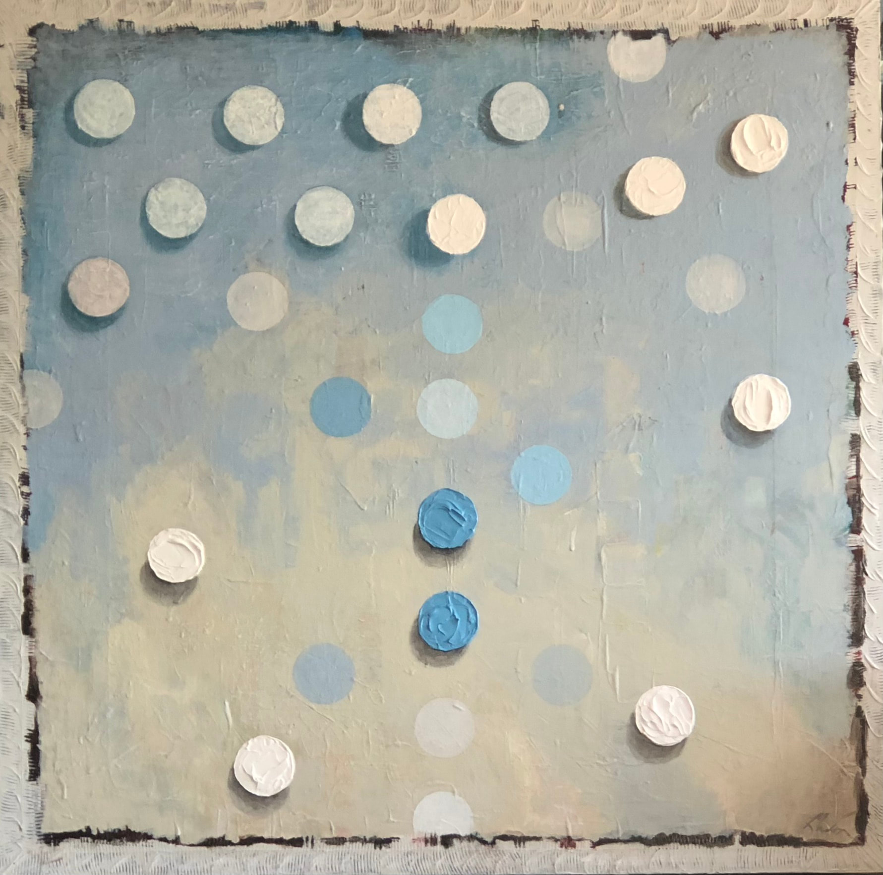 Power of One series. One can make a difference. Each dot color is mixed by hand, the color before it goes into the next dot and so on and so on. The dots are thick, high gloss acrylic paint on canvas or board. They appear to float over a textured background. The transparent shadows add to the dimension and illusion. Framed in a custom satin laquered wood frame.