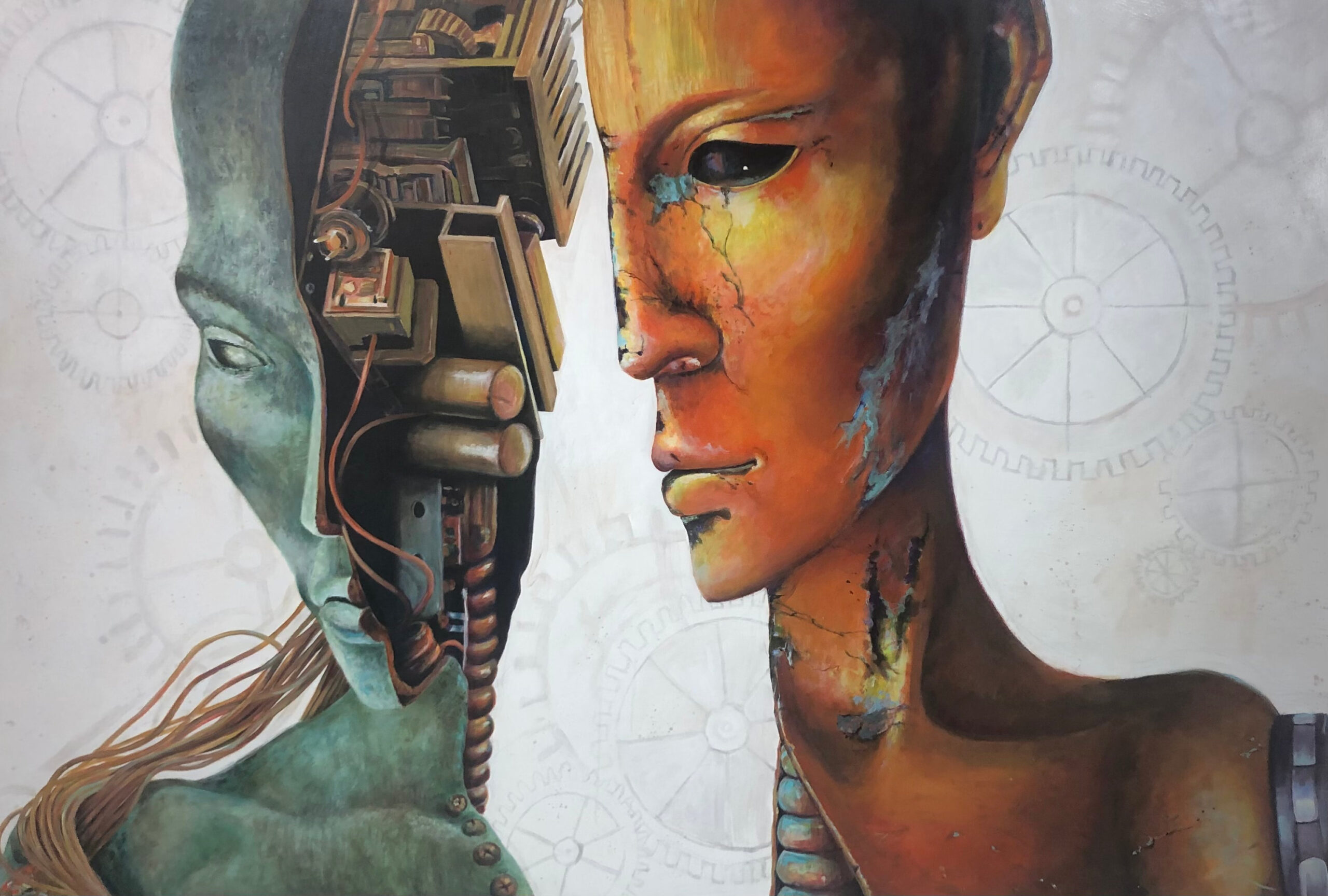 Inspired by one of the first pieces in Magnus Sebastian’s “Transhuman” series which was stolen from while on display in Delray Beach. The bold and rich colors of the figures over the ethereal, mechanical backdrop make for a dramatic statement piece. Shipping will be added after purchase.