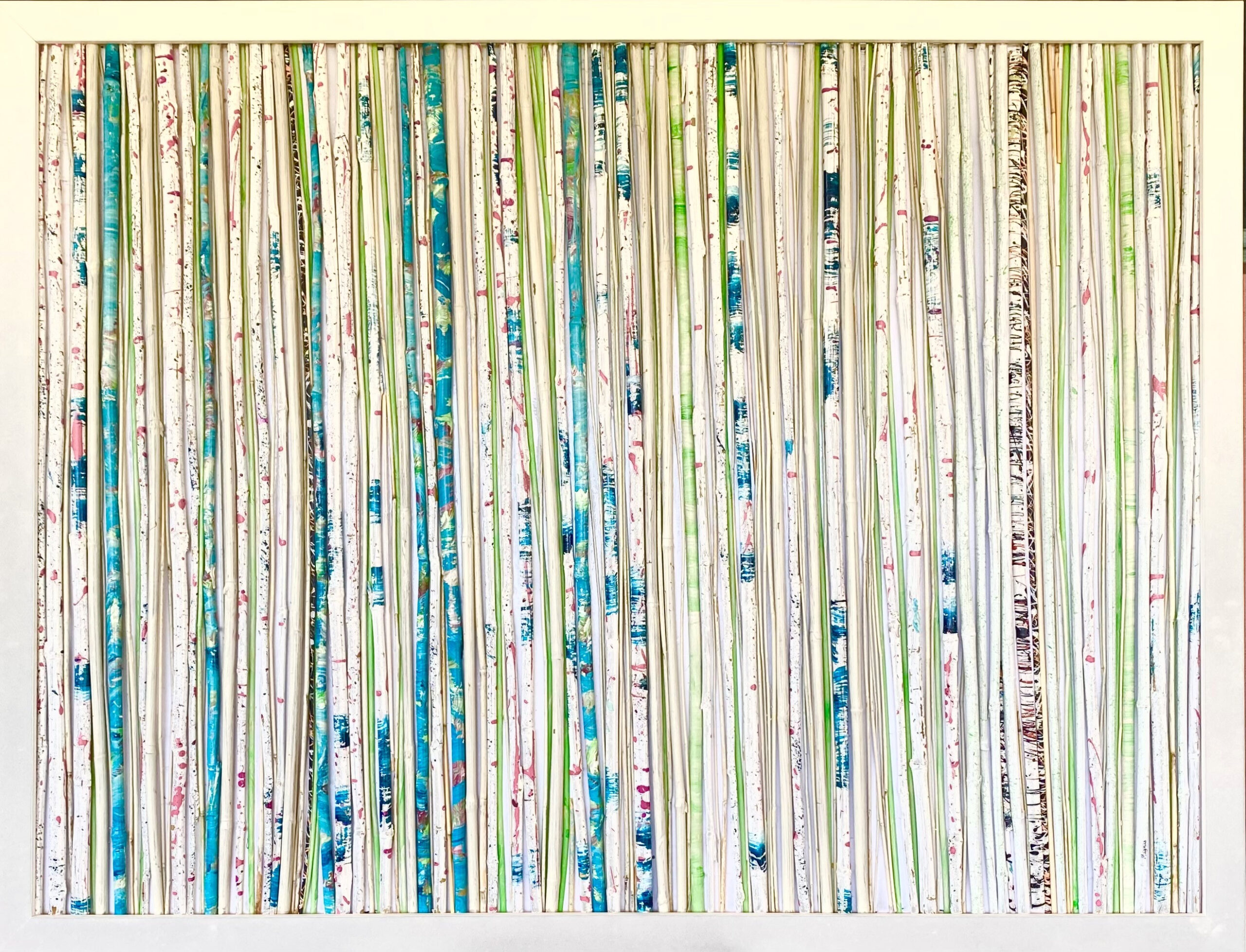 Individually hand-painted pieces of bamboo and elephant grass, selectively arranged and permanently mounted against a gradient painted backboard in a custom frame. Part of the "NatureScapes" series. Professionally framed in contemporary, white satin lacquered, solid wood frame. Shipping will be calculated after purchase and billed separately.