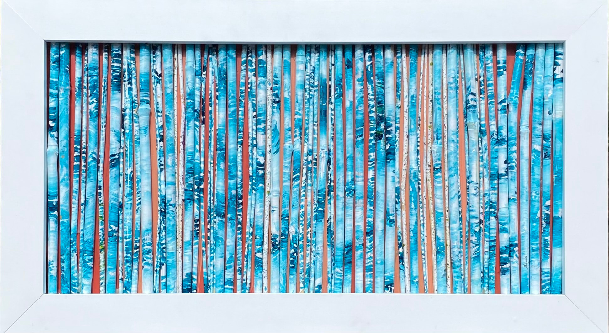 Individually hand-painted pieces of bamboo and elephant grass, selectively arranged and permanently mounted against a gradient painted backboard in a custom frame. Part of the "NatureScapes" series. Professionally framed in contemporary, white satin lacquered, solid wood frame. Shipping will be calculated after purchase and billed separately.
